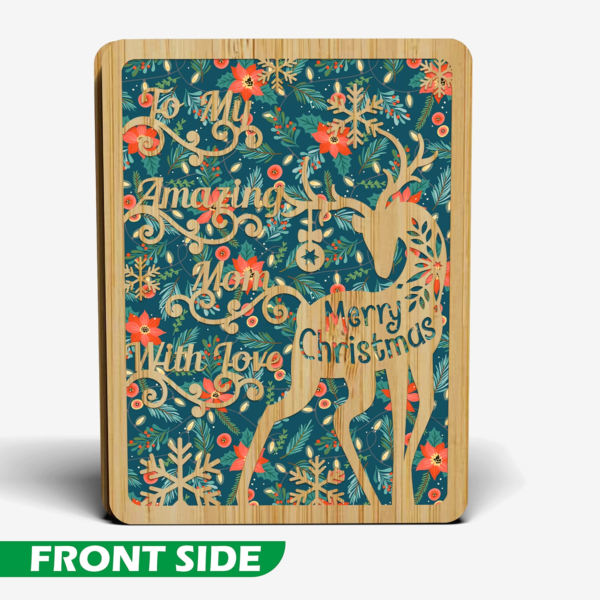 - Outside Cover - Cover features intricate laser cut deer on festive poinsettia background. Left side has "To My Amazing Mom With Love" laser cut text.