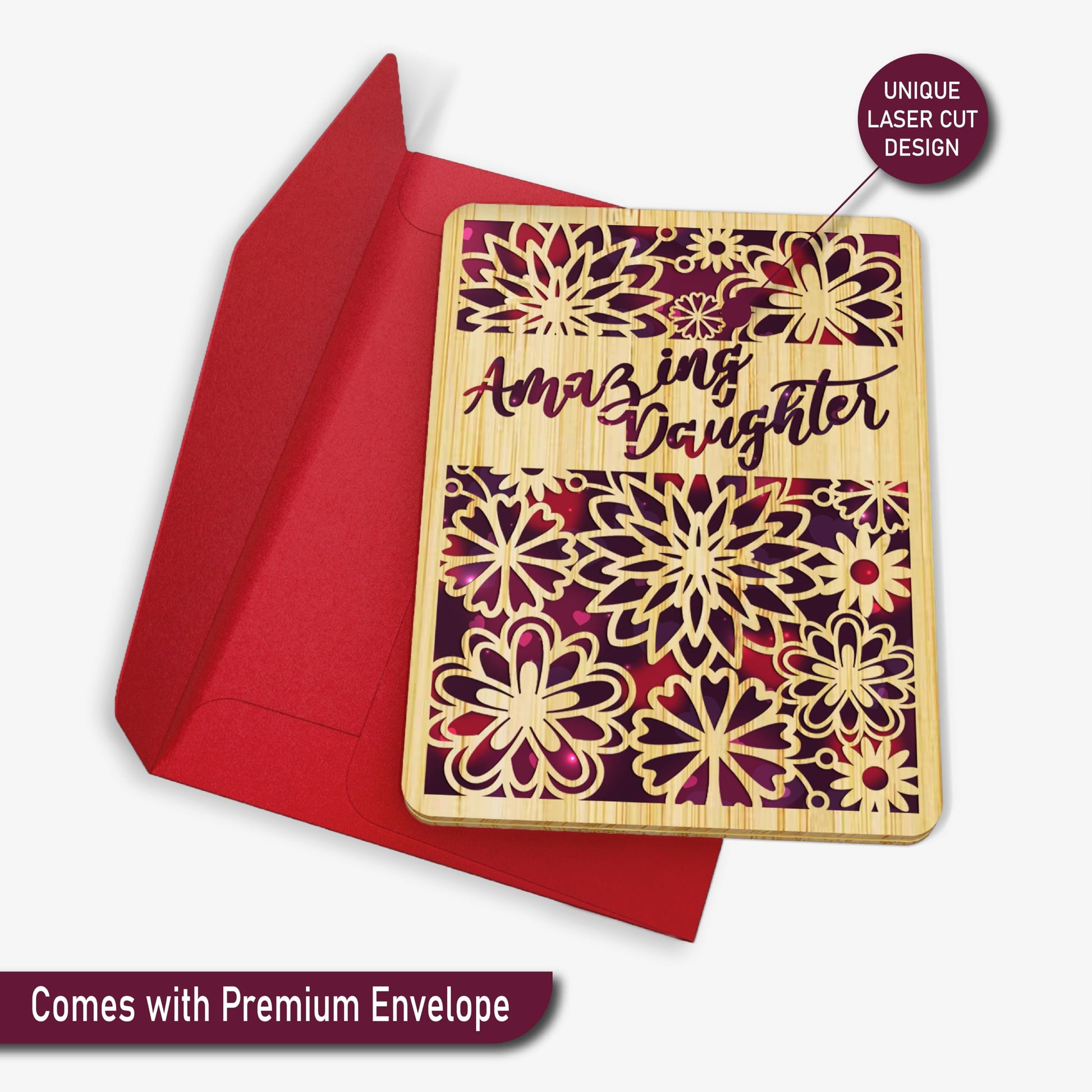 - Outside Cover - Cover features intricate laser cut flowers on elegant purple red background. Top right side has "Amazing Daughter" laser cut text.