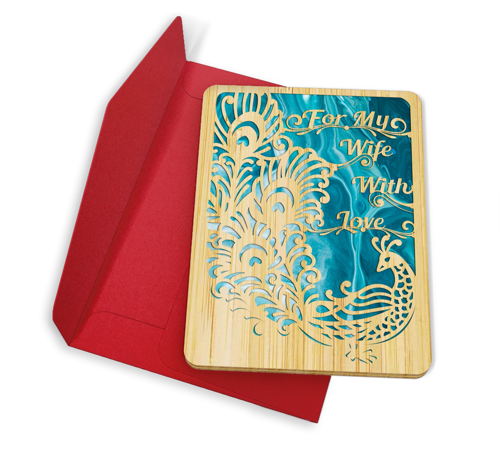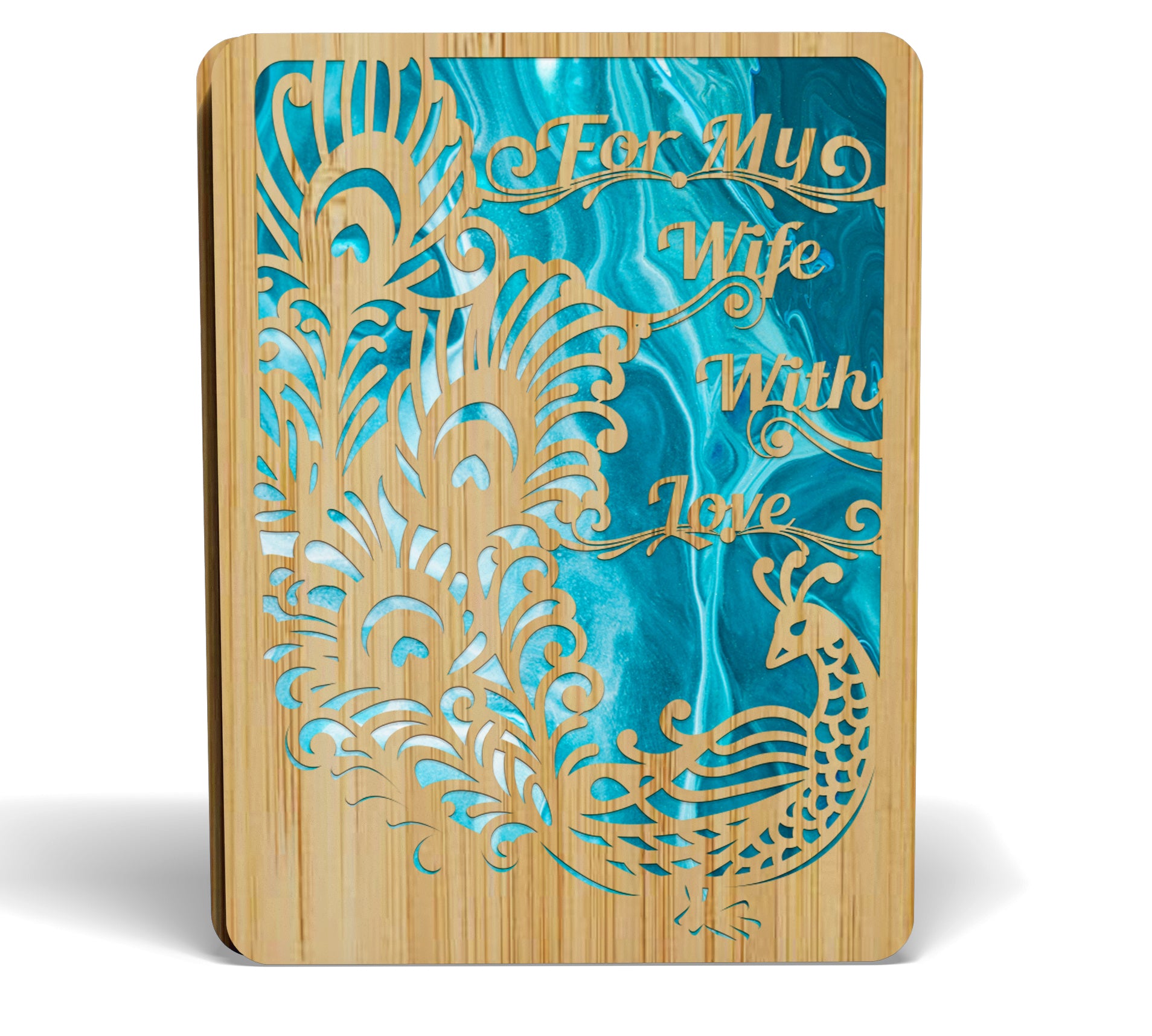 - Outside Cover - Cover features intricate laser cut peacock on elegant blue background. Top right side has "For My Wife With Love" laser cut text.